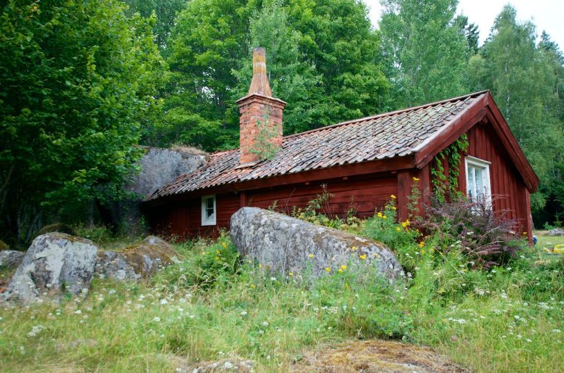 Jag har besökt den här platsen tidigare för många år sedan eftersom torpet är så unikt med en vägg som utgörs av en stor sten. Det här torpet finns också avtecknat på en tavla av Olle Söderbäck. Jag var lite nyfiken på om torpet fortfarande fanns kvar och i så fall i vilket skick.  Därför tog jag min kamera och åkte ut till torpet för att ta några bilder på platsen och visst fanns torpet kvar. Det finns också lite spår av liv på platsen och att någon också ansvarade för och tog hand om torpet. På gården stod en lite midsommarstång som var helt brun och vissen, men ändå måste vara från årets midsommarfirande.