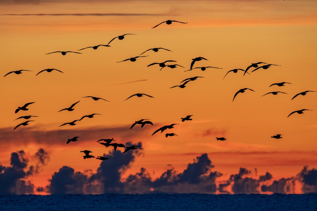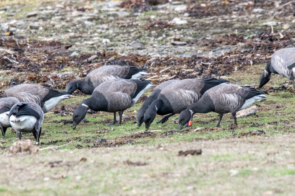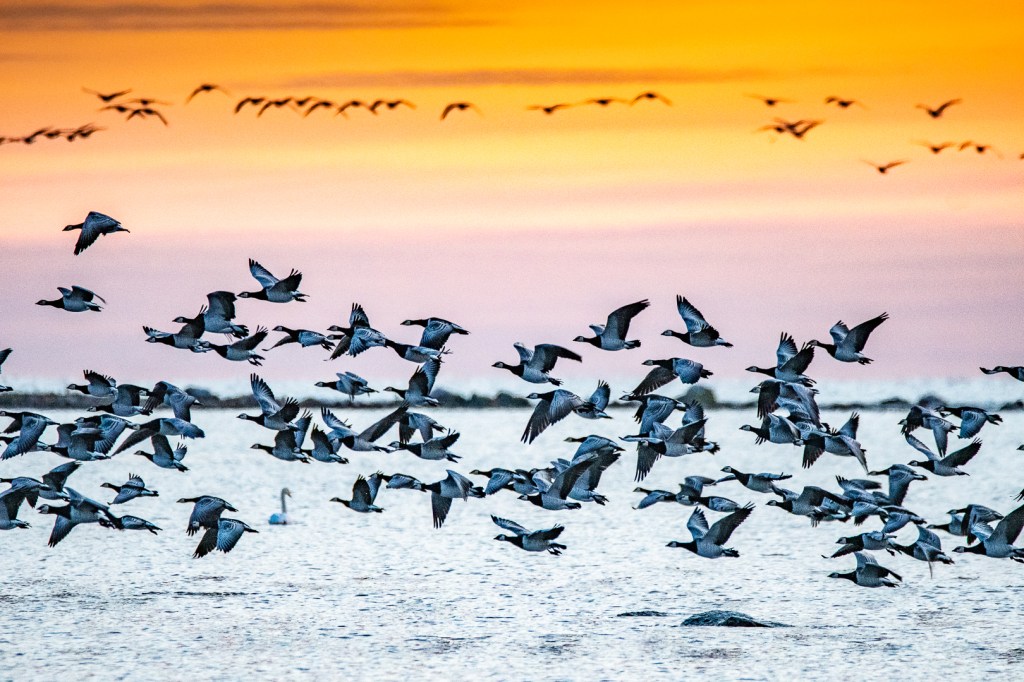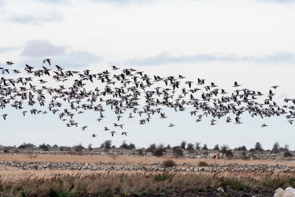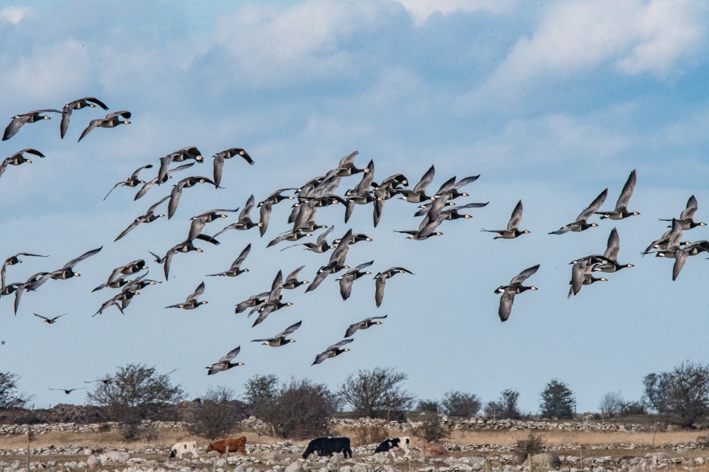 Redan på kvällen när jag kom och under natten hördes att det var ett stort antal gäss som låg ute i vattnet runt hamnen. När ljuset kom fram på morgonen ökade ljudet väsentligt i sin intensitet och plötsligt lyfter sedan flera tusen vitkindade gäss från vattnet och flyger in mot land för att äta på åkrar och fält.