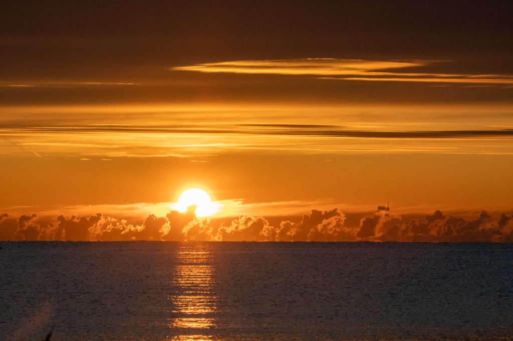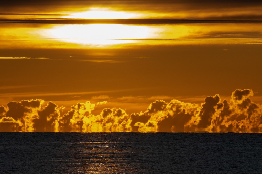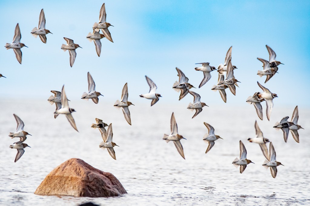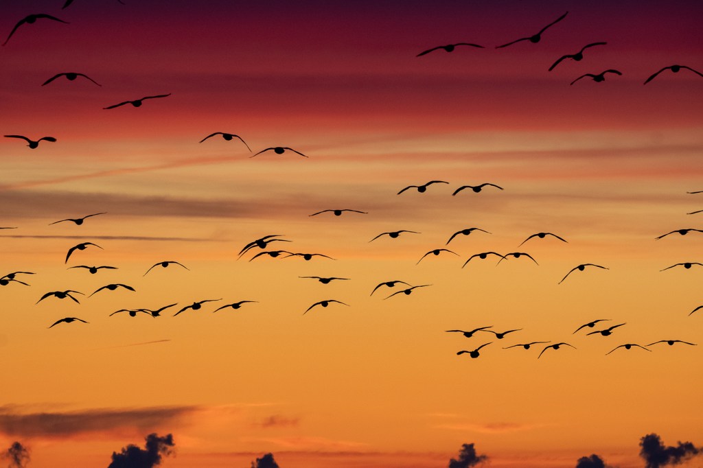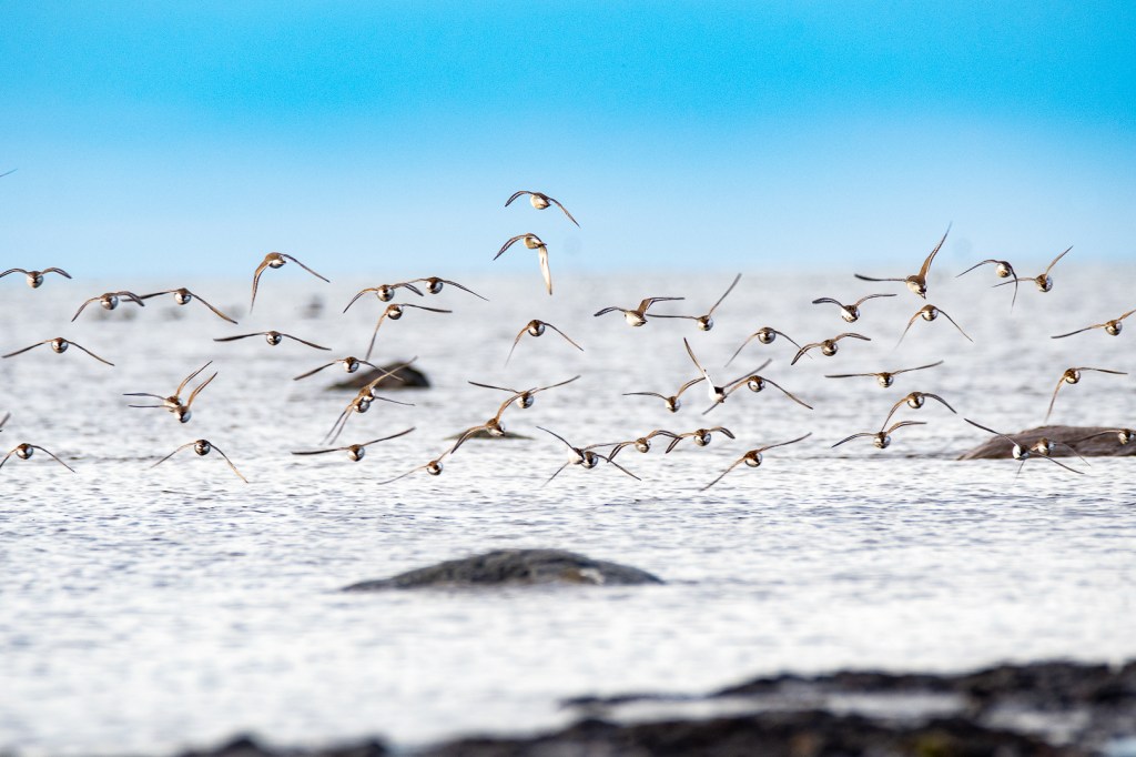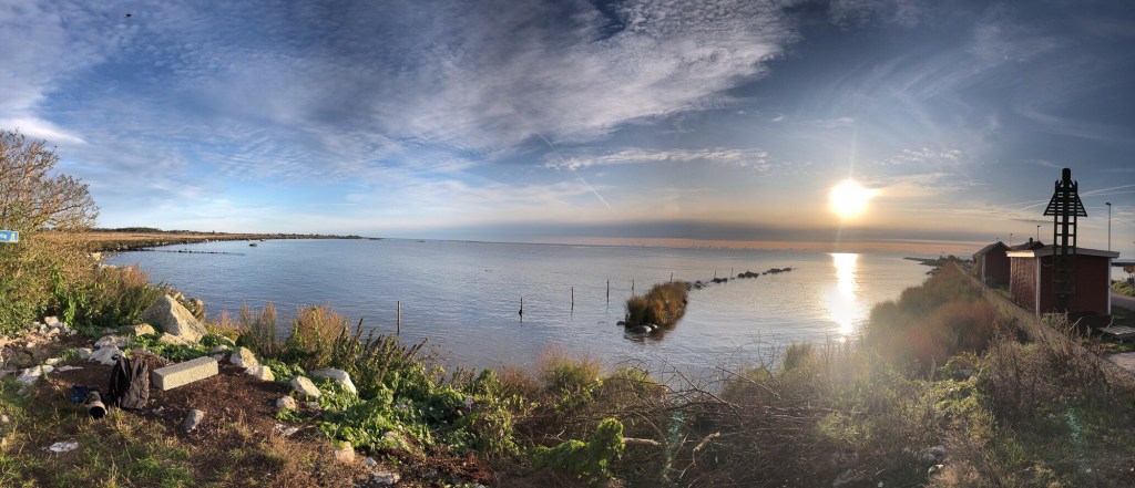 Redan på kvällen när jag kom och under natten hördes att det var ett stort antal gäss som låg ute i vattnet runt hamnen. När ljuset kom fram på morgonen ökade ljudet väsentligt i sin intensitet och plötsligt lyfter sedan flera tusen vitkindade gäss från vattnet och flyger in mot land för att äta på åkrar och fält.