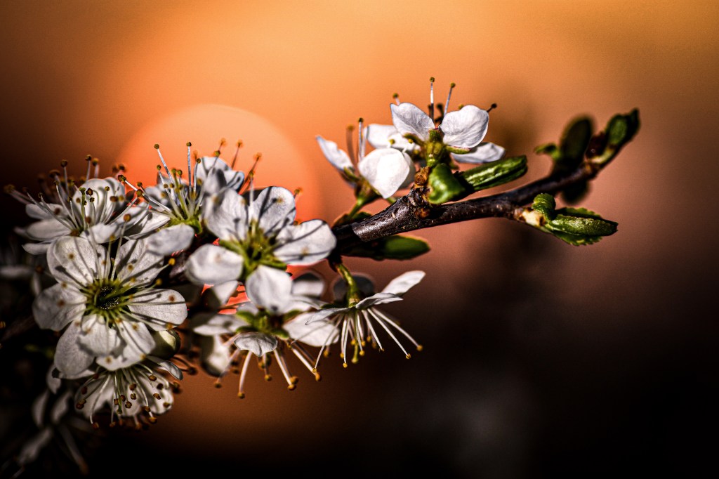 Körde sedan söderut igen och stannade vid Borgholms slottsruin. Det var egentligen först nu som jag också bestämde att köra tillbaka till fastlandet igen. Att jag kan ge mig ut på ”Walkabout” på egen hand bygger också på att jag har en mycket förstående hustru. Men vi har ju förutom Husbil även en personbil vilket i det här fallet skapar bra förutsättningar… Vi har nämligen bestämt träff till Kristi Himmelsfärd om jag befinner på tillgängligt avstånd. När vi pratat en stund på telefon bestämde vi att vi skulle träffas på Stensö Camping i Kalmar. Så jag körde åter igen till Svinö på Kalmarsidan för en natt till där. Det har blivit den 13 maj och jag kör till Stensjö Camping och checkar in för två nätter. Efter några timmar så kommer Helena min fru dit. Vi promenerar runt på Stensö och njuter av det underbara vädret. Vid tiden för solnedgång tar jag fram mitt Macro-objektiv som annars tyvärr blir använt alltför sällan. Men jag fångar en del av en buske Hägg mot solnedgången.