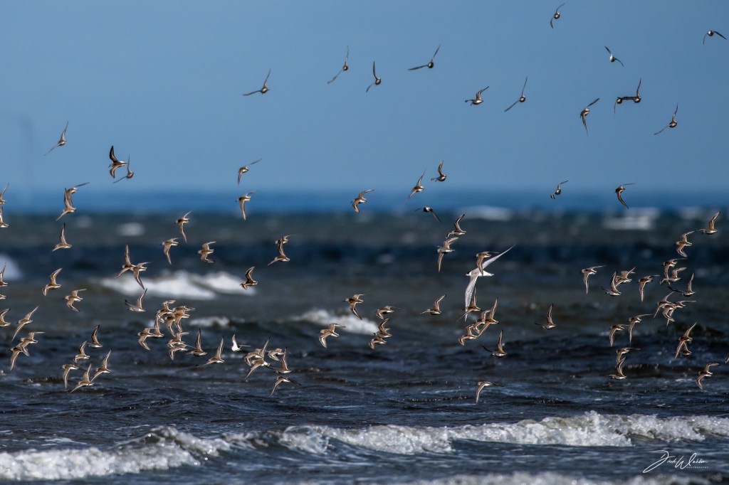 När man sitter vid stranden och fotograferar så är det inte ovanligt att helt plötsligt lyfter alla fåglar på en gång och flyger iväg i gemensam formation ett eller flera varv för att sedan landa igen på ungefär på samma plats