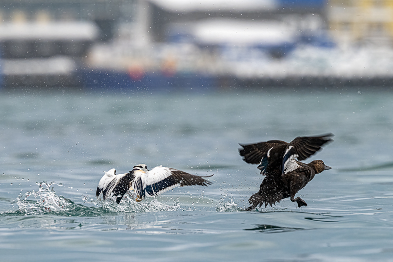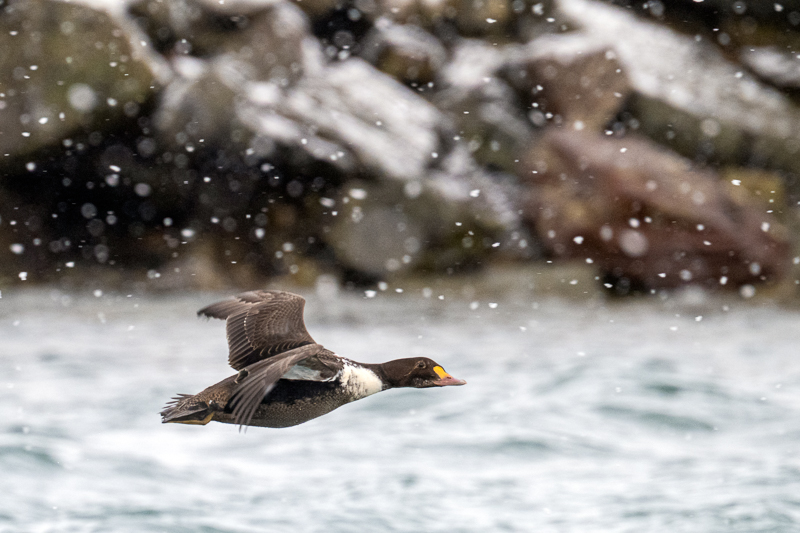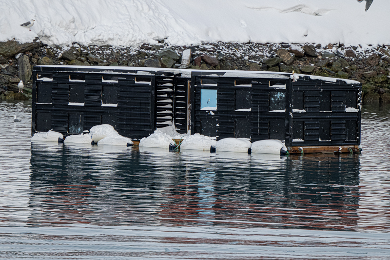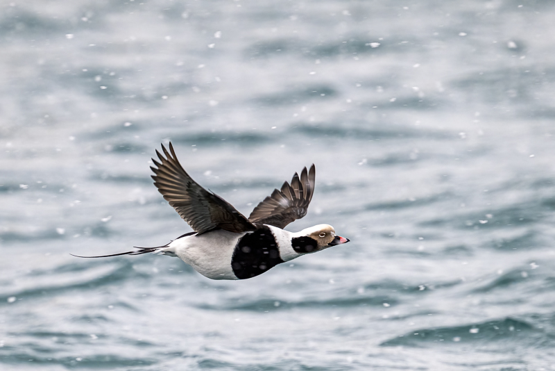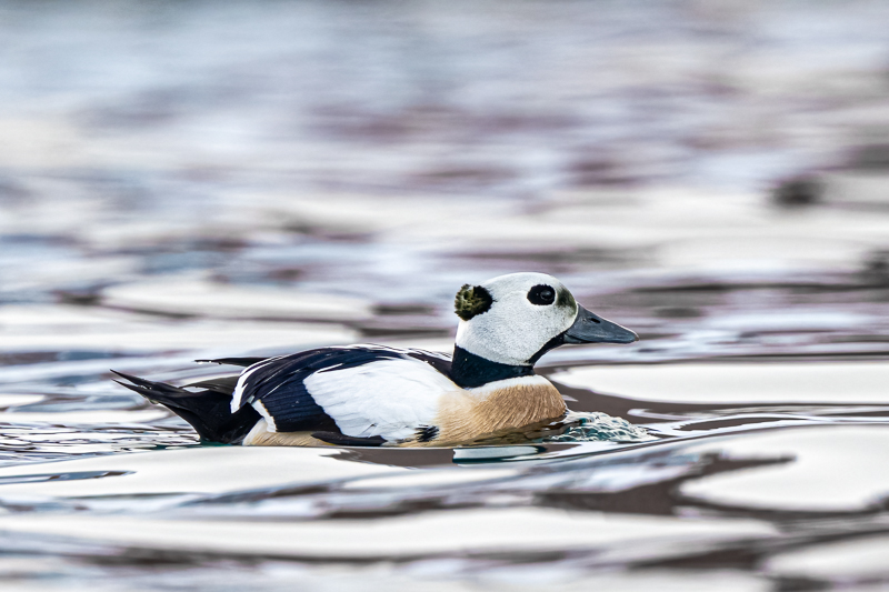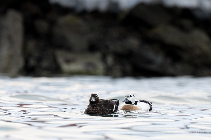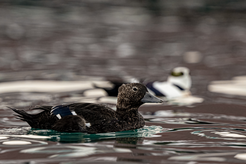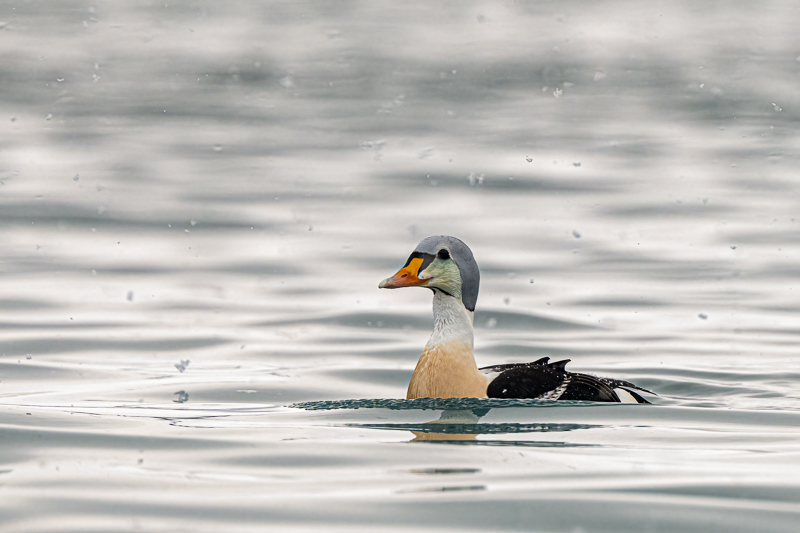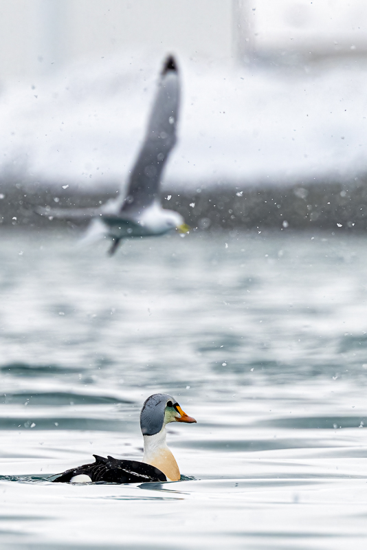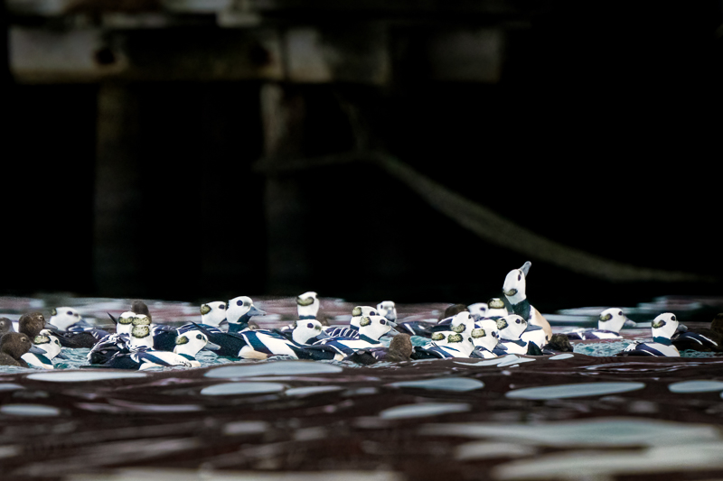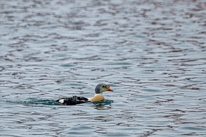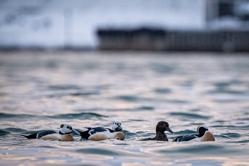 För mig blev det ungefär 2,5h timme sömn den natten. I god tid före 03:15 stod jag klar vid Minibussen med fotoutrustningen samt den frukost som jag tänkte äta ute i det flytgömsle som vi var på till. Efter en kort körning i Båtsfjord kom vi fram till vår utgångsplats. Först gällde det att prova ut tjocka överdrags-overaller för att klara kylan och senare även den starka vinden under båtturen ute på Fjorden. Själva Flytgömslet låg alltså i hamnen och var en flotte med en överbyggnad. Inne gömslet fanns sedan luckor på både sitt och ligghöjd. Självklart vill man helst använda de undre luckorna för att kunna fotografera jäms med vattenytan, även om det ibland kom en våg och skvätte in vatten där man låg på golvet. Här kommer bilder på några arktiska fåglar fotograferade både från gömslet samt den efterföljande båtturen ute på fjorden