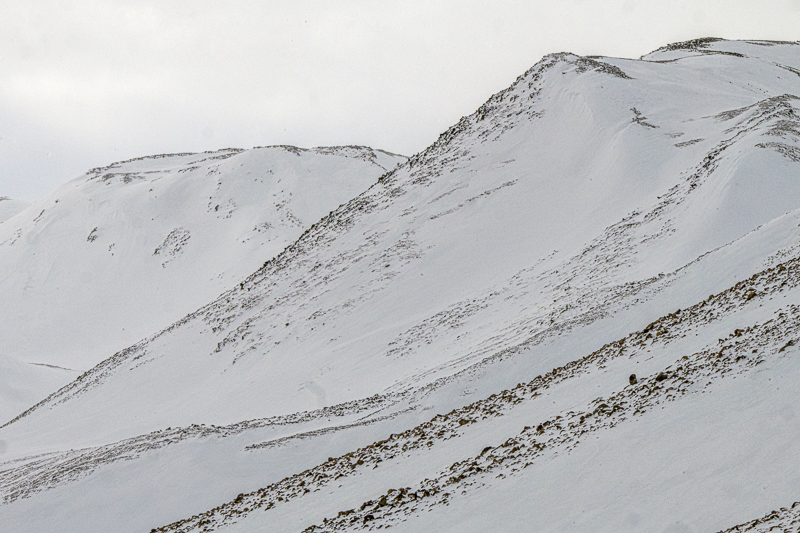 Några färgbilder ovan ser nästa ut som svartvita. Vädret växlade fort från det att solen ibland bröt igenom molnen till att vinden piskade upp snön och sikten blev minimal. Med det är precis som man förväntar sig här uppe i de arktiska landskapen.