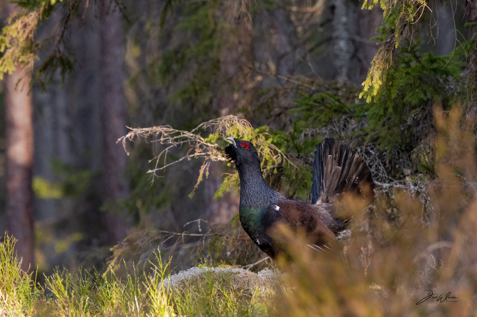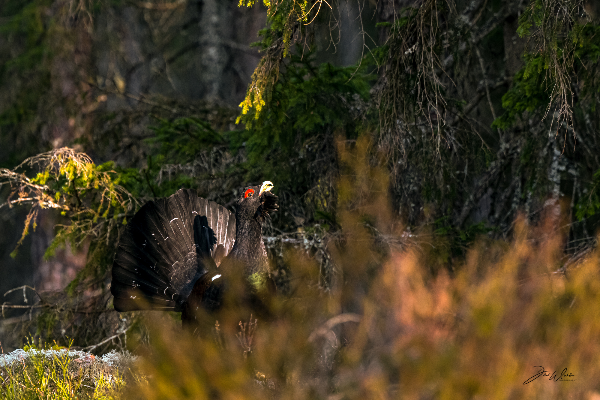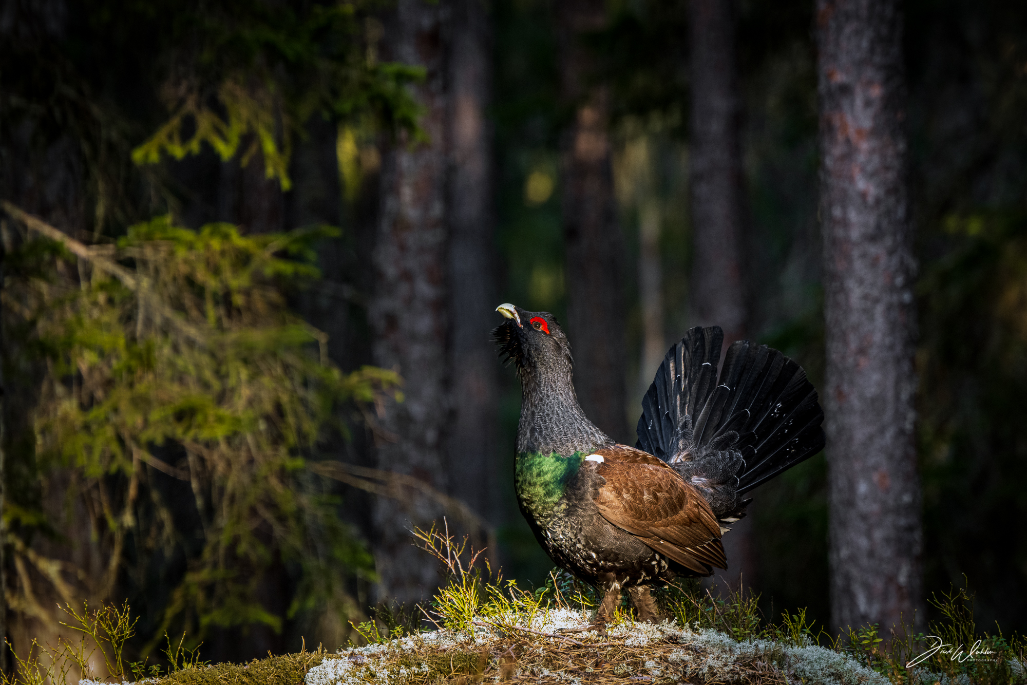 Bilden här ovanför är nog den som jag själv tycker allra bäst om. Tjädern står på en stenhäll och kikar upp för att välja vilken Tall han ska flyga upp i för att äta. Ljuset tycker jag ligger helt perfekt i den här bilden som är tagen med f /6,3, ISO 800 och 1/160 sekund.