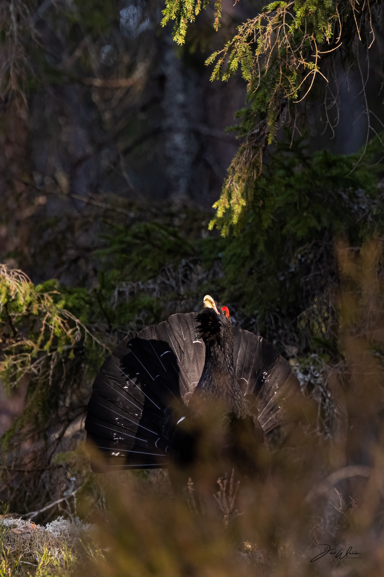 Här följer och avtecknar sig Tjädertuppens hals och huvud mot grenen i bakgrunden. Bilden är tagen med en Nikon Z7 II med ett Nikon Z 70 -200 f2,8 + 2,0 TC. Jag använder manuella inställningar och i den här bilden f /7,1, ISO 1 250, och 1/250 dels sekund. Jag hade givetvis kunnat dra ner på ISO och ökat bländaröppningen i det här fallet.