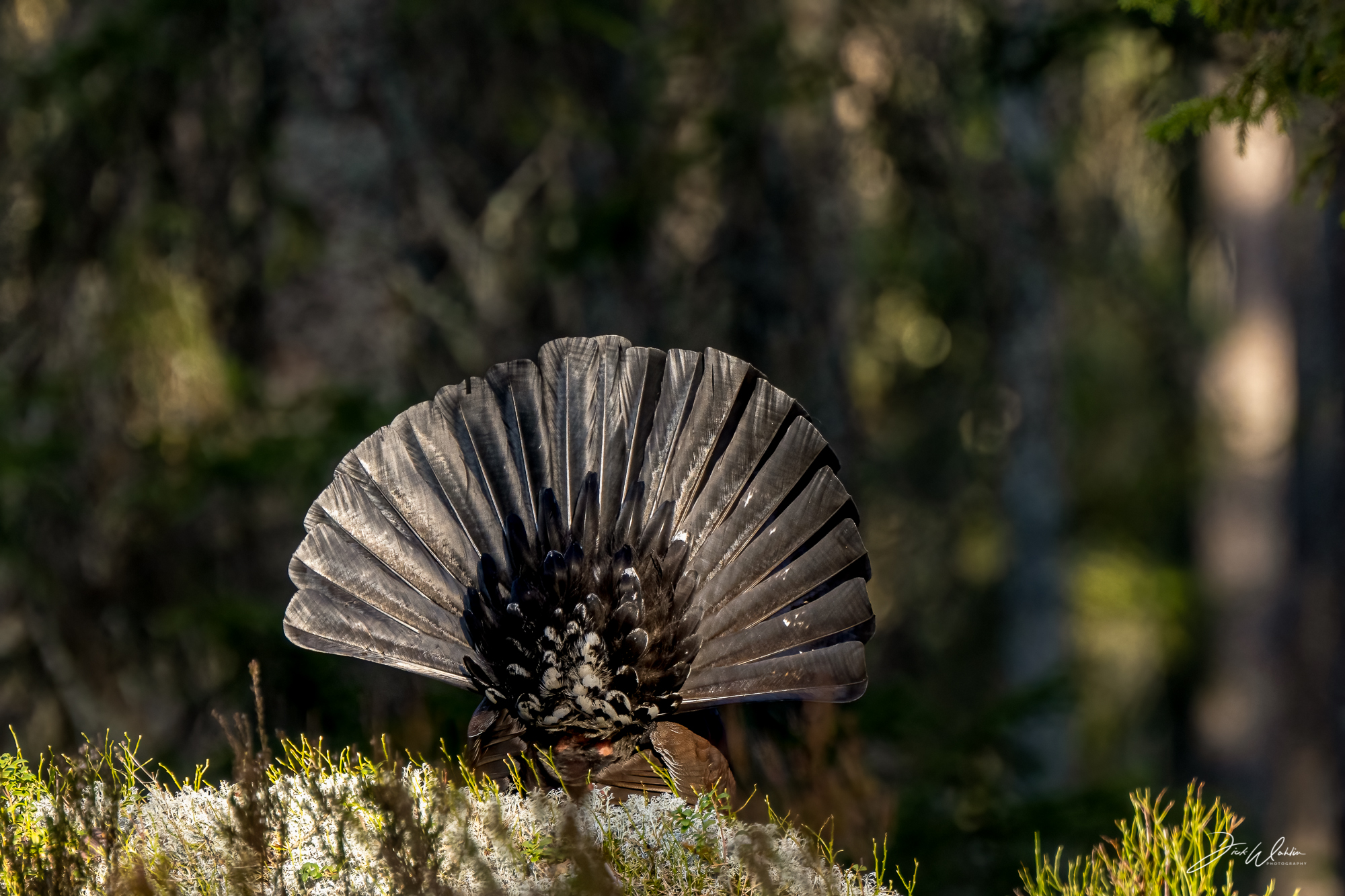 Avslutar med tre bilder där Tjädern bildligt säger hej då genom att bakifrån visa upp sina fina stjärtfjädrar. Även här gillar jag ljuset och särskilt på den första bilden där halsfjädrarna bildar ett oerhört vackert mönster. Rekommenderar även här att du klickar på bilderna för att se dem i större format.