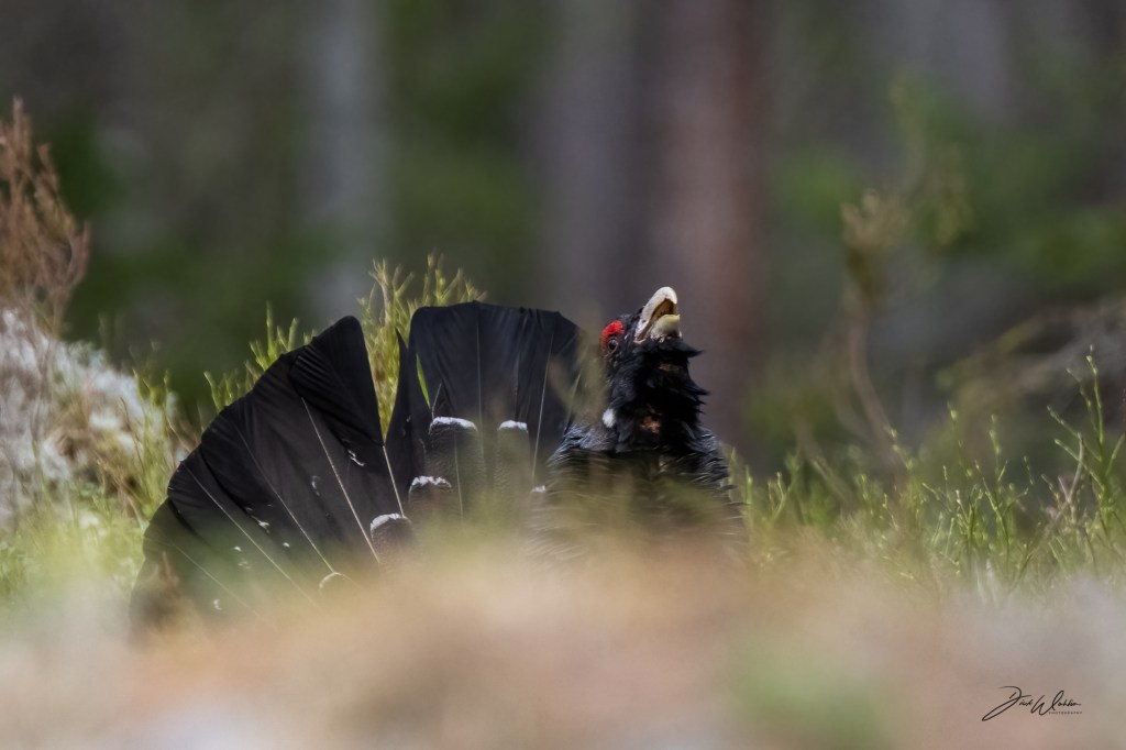 Det Tjäderspel som jag var på den här gången, den 26-28 april 20232 innebar att spelet redan pågått på platsen i flera veckor och parningar hade redan skett. Därför var spelet inte så intensivt men gav istället möjlighet till att lugnt studera den här oerhört vackra fågeln när den gick omkring och markerade revir mot andra tuppar i området. Jag hade också turen att mitt gömsle låg till så att jag flera gånger under de två dygn jag bokat hade ”Kungen” framför mitt gömsle. Alltså jag hade den Tjädertupp som vunnit alla sina kamper och fortplantat sig flest gånger det här året rakt framför mitt gömsle och i bra ljus flera gånger.